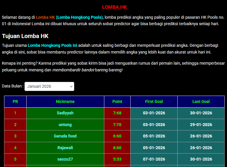 Selamat datang di Lomba HK (Lomba Hongkong Pools), lomba prediksi angka yang paling populer di pasaran HK Pools no. 01 di Indonesia! Lomba ini dibuat khusus untuk seluruh sobat predictor agar bisa berbagi prediksi terbaiknya setiap hari.