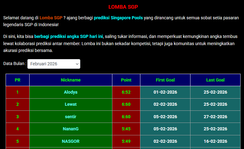Lomba SGP adalah forum prediksi angka Singapore Pools yang terbuka untuk semua. Tujuan utama dari lomba ini adalah: